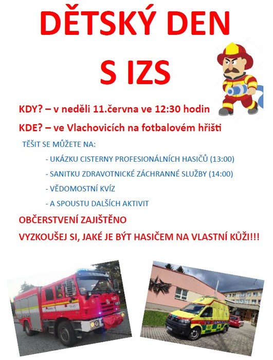 Rádi bychom vás pozvali na posunutý dětský den, tentokrát s ukázkami Integrovaného záchranného systému. Občerstvení zajištěno, doplňkové aktivity i drobný dárek také. Akce je vhodná i pro dospělé. Tak v neděli 11.6. od 12:30 na fotbalovém hřišti ve Vlachovicích.